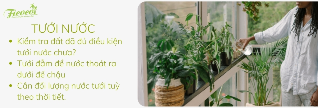 Vì vậy, đầu tiên hãy kiểm tra đất ở gốc cây có khô hay không? Nếu khô bạn mới cần phải tưới nước. Khi tưới nước, bạn nên tưới đẫm sao cho nước thất thoát ra dưới chậu cảnh thì ngừng tưới.