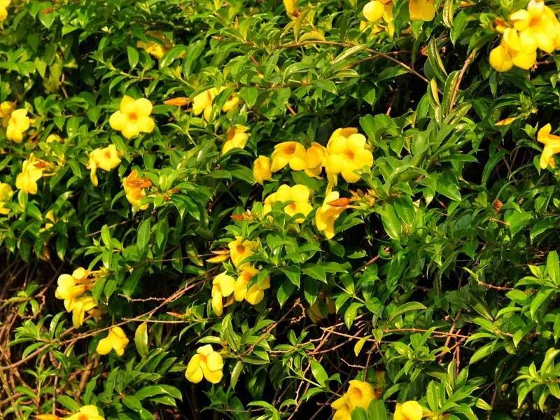 Cây huỳnh anh với hoa vàng rực rỡ tô điểm cho hàng rào.