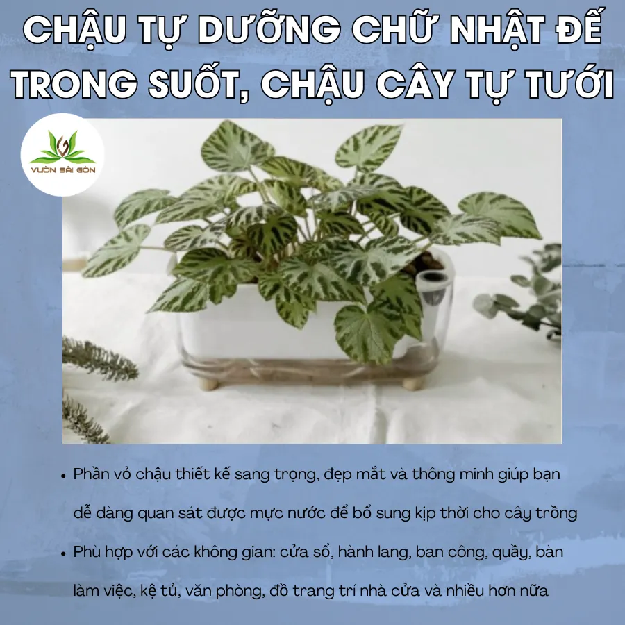 Chậu tự dưỡng chữ nhật đế trong suốt giúp quan sát mực nước dễ dàngChậu tự dưỡng chữ nhật đế trong suốt giúp quan sát mực nước dễ dàngHình 1: Thiết kế hiện đại của chậu tự dưỡng chữ nhật phù hợp với mọi không gian nội thất.