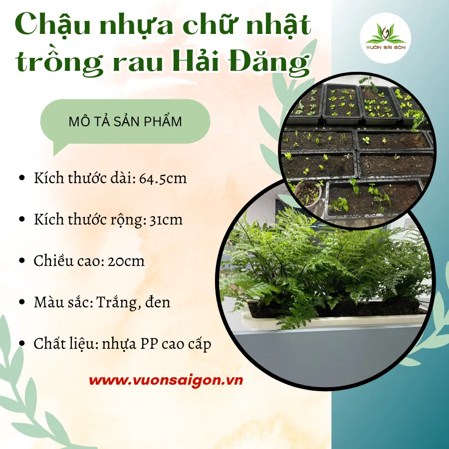 Kích thước 64.5cm x 31cm x 20cm phù hợp trồng 6-8 cây rau ăn lá hoặc 3-4 cây rau ăn quả